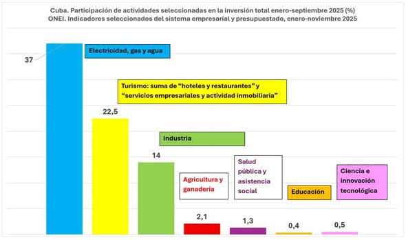 La Habana.- Los datos oficiales de inversión para el período enero-noviembre de 2025, publicados por la Oficina Nacional de Estadística e Información (ONEI), revelan un patrón de asignación de recursos que, lejos de corregir los desequilibrios históricos de la economía cubana, los consolida y agrava. La distribución del gasto de capital evidencia una alarmante desconexión entre las prioridades declaradas por el gobierno y las necesidades urgentes para superar la crisis estructural que paraliza al país.