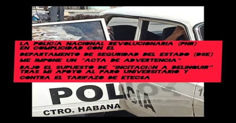 Por Raymar Aguado La Habana.- La Policía Nacional Revolucionaria (PNR), en complicidad con el Departamento de Seguridad del Estado (DSE), me impone un «Acta de Advertencia». Esto es bajo el supuesto de «Incitación a delinquir» tras mi apoyo al paro…