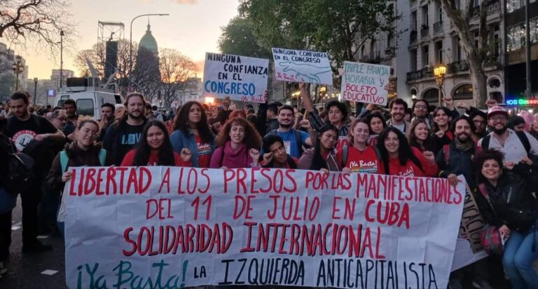 Por Redacción Internacional Buenos Aires.- Jóvenes miembros del Nuevo Movimiento al Socialismo levantaron un gran cartel donde se leía «Libertad a los presos por las manifestaciones del 11 de Julio en Cuba», durante una marcha federal universitaria ocurrida en las…