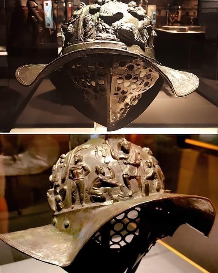 Este casco pertenecía a un murmillo, un tipo de gladiador conocido por su genial tocado en forma de pez. Tiene unos grabados muy elegantes que muestran lo hábiles que eran los fabricantes de armaduras romanos.