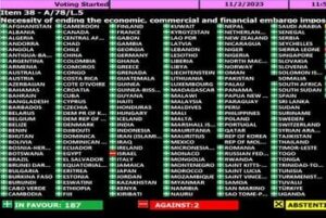 – Año 2028, Cuba, con una economía muy débil, solicita en las Naciones Unidas el levantamiento del injusto Bloqueo, que tanto la afecta y por culpa de él esta en ese estado.