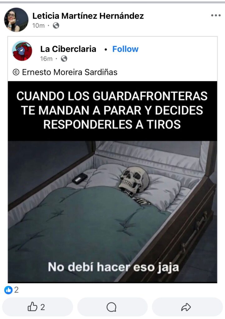 Construyen un teatro sangriento para jugar con la mente del cubano, demostrando un nivel de bajeza y desprecio total por la vida humana; al punto que cómplices como Leticia Martínez, jefa de prensa de Díaz-Canel, festejan la masacre compartiendo memes de esqueletos en ataúdes con la burla literal de «CUANDO LOS GUARDAFRONTERAS TE MANDAN A PARAR Y DECIDES RESPONDERLES A TIROS» y rematando con un sádico «No debí hacer eso jaja» sobre los cadáveres aún calientes.