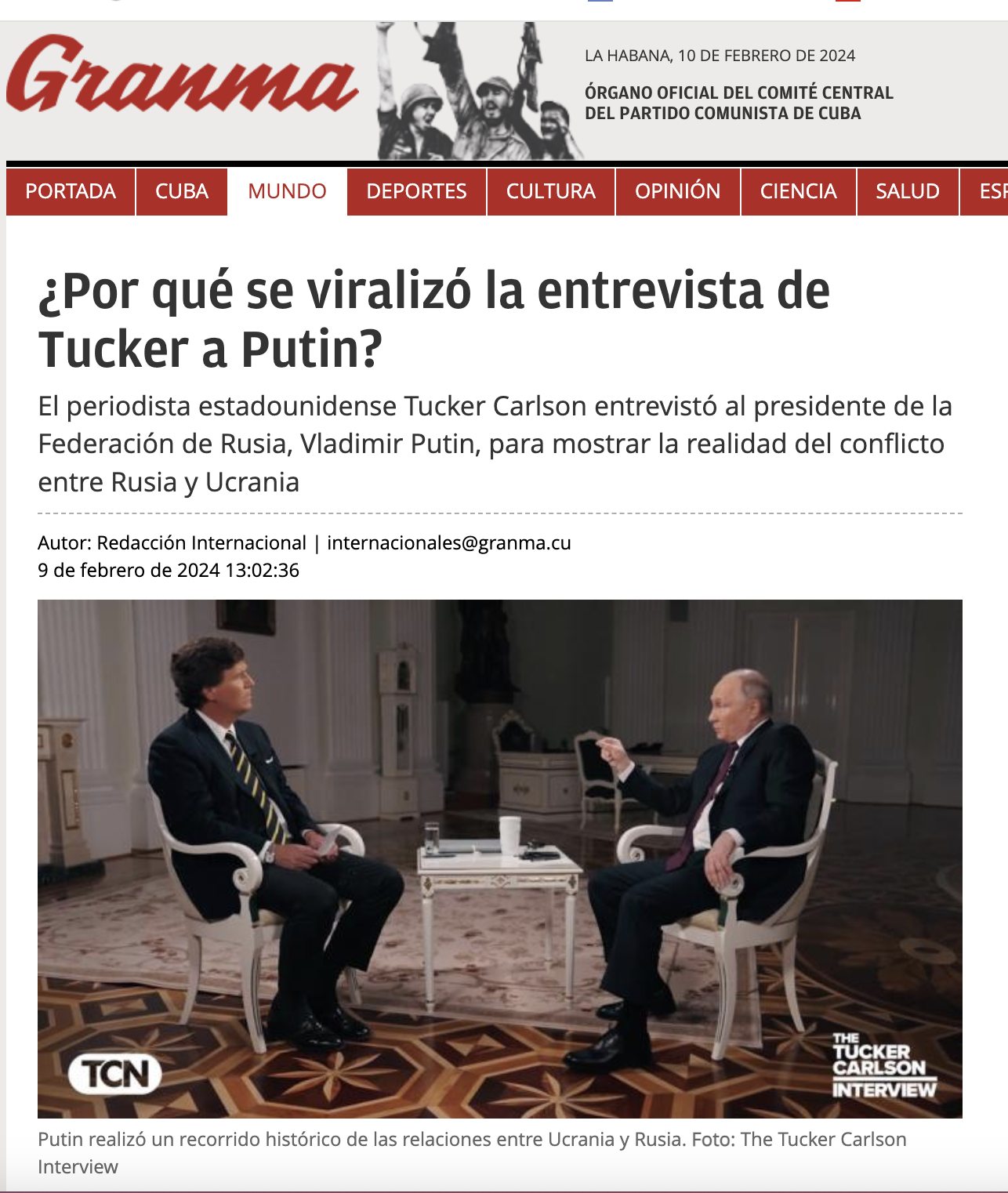 La nota comienza con esta «perla»: «El periodista estadounidense Tucker Carlson entrevistó al presidente de la Federación de Rusia, Vladimir Putin, guiado por el propósito de mostrar la realidad del conflicto entre Rusia y Ucrania a la mayoría de los estadounidenses, desinformados sobre el asunto.» Y subrayo esto último. No está entre comillas, por tanto es evidente que Granma comparte ese enfoque.