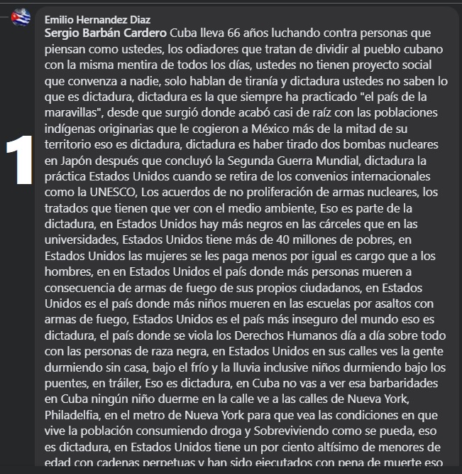 Como pueden ver en las capturas de pantallas, es típico panfleto de un esbirro del castrismo, con ese guion viejo y aburrido. Cuando no pueden defender lo indefendible en Cuba, se lanzan a hablar de los errores de Estados Unidos, como si eso justificara 66 años de hambre, miseria, represión y fracaso económico en su país.