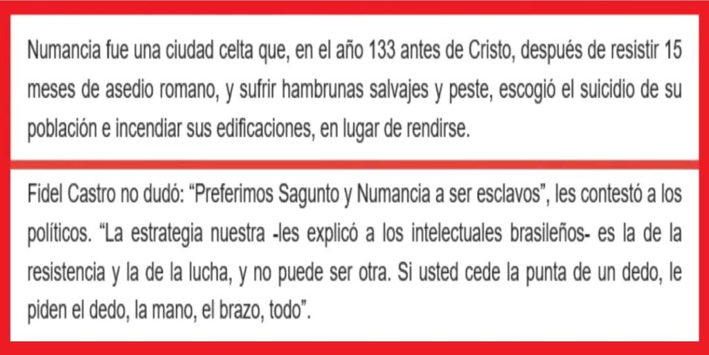 La cita reiterada de Fidel Castro refuerza esta lógica: “Preferimos Sagunto y Numancia a ser esclavos”.