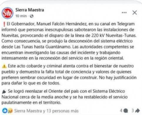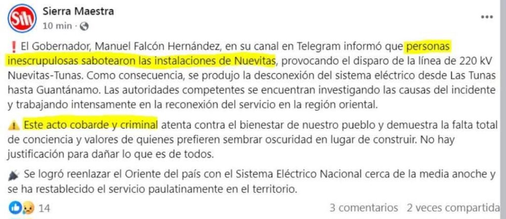En su primera publicación en redes sociales, el medio citó declaraciones del gobernador santiaguero, Manuel Falcón Hernández, quien aseguró en su canal de Telegram que “personas inescrupulosas sabotearon las instalaciones de Nuevitas, provocando el disparo de la línea de 220 kV Nuevitas–Tunas”.