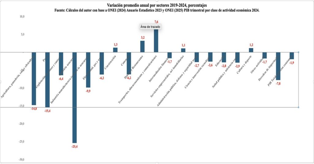 Los resultados son más que evidentes. El derrumbe de los sectores productivos con desempeños negativos promedio anuales para el período 2019-2024. Gravísima es la situación de la industria azucarera (-25,4%); pesca (-15,4%); agricultura, ganadería, caza y silvicultura (-14,8%); industria manufacturera, excepto la azucarera (-9,9%); explotación de minas y canteras (-6,4%); suministro de electricidad, gas y agua (-6,2%); comercio (-6,2%); salud pública y asistencia social (-2,9%); educación (-2,8%); administración pública, defensa y seguridad social (-2,7%); ciencia e innovación tecnológica (-2,6%); intermediación financiera (-1,7%); otras actividades (-1,7%) y los derechos de importación (-7,8%).