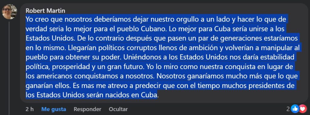 Miami.- El comentario de Robert Martin adjunto a este texto, parte de una intuición honesta: el miedo a que, aun después de un cambio, Cuba vuelva a caer en el mismo ciclo de corrupción, caudillismo y manipulación. Esa desconfianza en nuestras propias élites no es gratuita; nace de una experiencia histórica dolorosa. Por eso el autor ve en la anexión una especie de “atajo institucional”; no una rendición, sino la búsqueda desesperada de reglas estables que nos protejan de nosotros mismos.