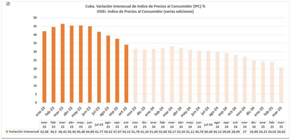 La Habana.- La inflación creció 1,22% en marzo de 2025. Es la primera vez en 6 meses que el aumento no es mayor que el del mes precedente. Esa tasa mensual de 1,22% equivale a una tasa anualizada de 16%. Este nivel muy alto indica un estado de desequilibrio macroeconómico.