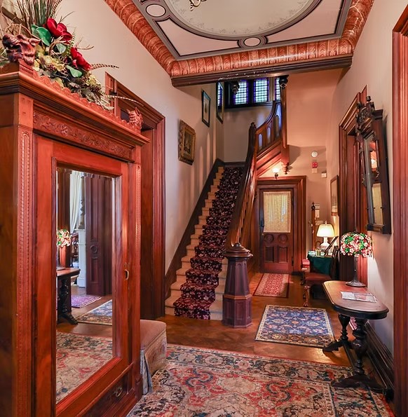 Arquitectura: El edificio de ladrillo rojo de 2.5 pisos exhibe arquitectura italianizante y presenta una terraza de piedra arenisca y un campanario. Sus interiores de la era victoriana cuentan con techos altos, chimeneas de mármol y espejos dorados.