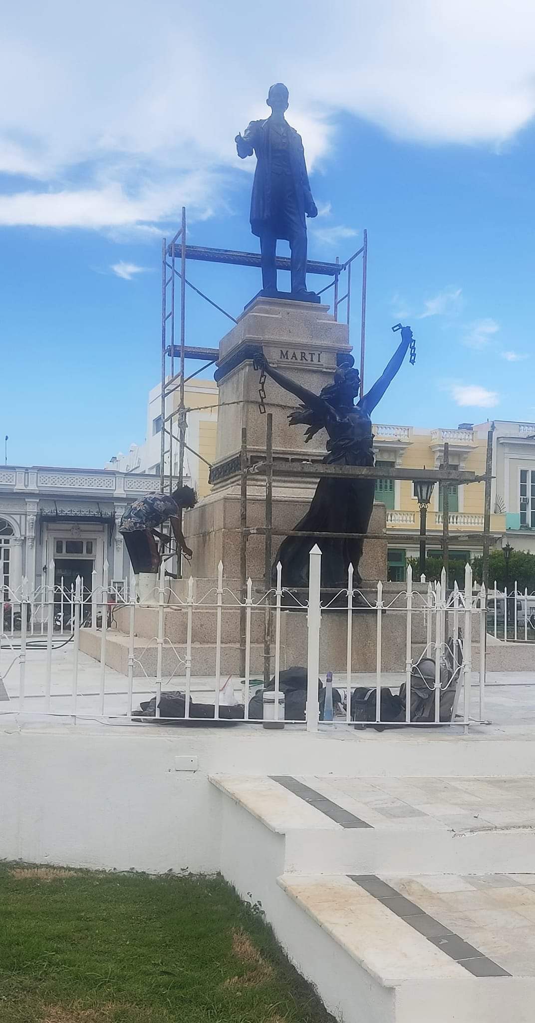 Algo inusual hoy fue que el conjunto escultórico de Martí y la Libertad estaba rodeado de andamios y siendo limpiado meticulosamente.