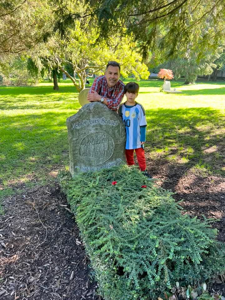Y ya, con su acento, Lucas entendió. Ahora estamos en la foto, delante del monolito cavado en piedra, con un verso de La Batalla de Maldon en sajón antiguo. Lucas luce la camiseta albiceleste con el Messi y el número 10.