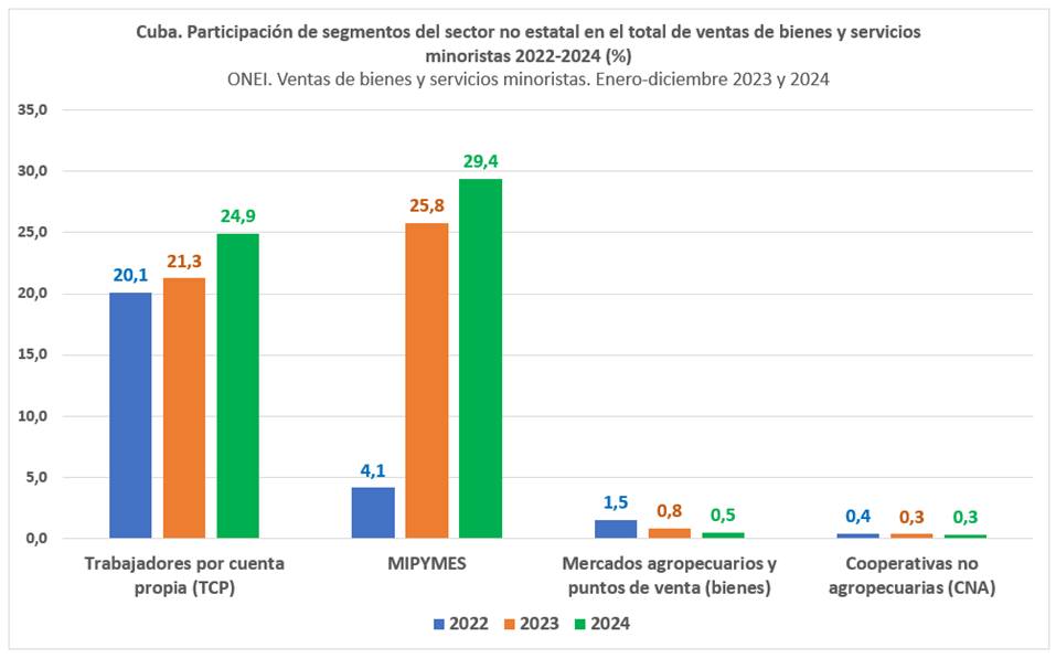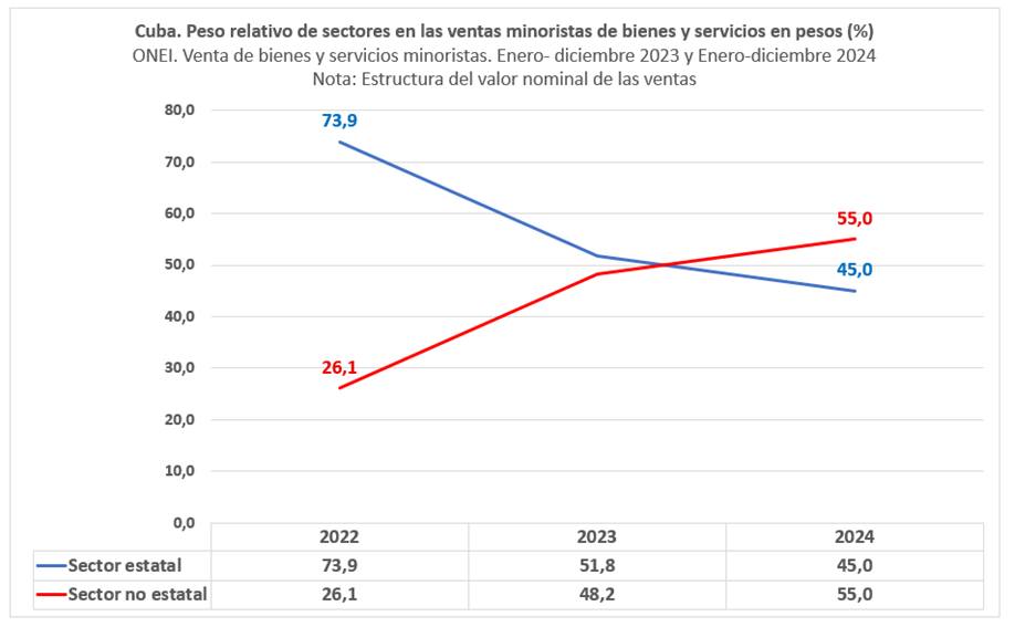 La Habana.- En 2024 el peso relativo de las ventas minoristas no estatales en pesos cubanos superó por primera vez el % de las ventas estatales, con predominio de MIPYMES privadas en el sector no estatal y con notable caída en el valor “real” de las ventas estatales de alimentos.