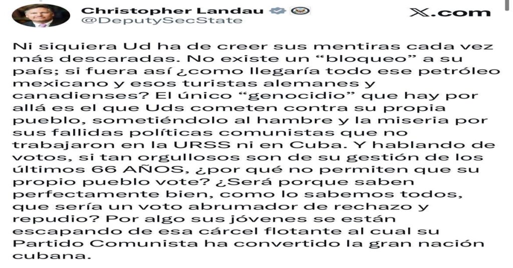 La Habana.- Christopher Landau, subsecretario de Estado de Estados Unidos no dijo nada nuevo. Simplemente desnudó, con la crudeza del que ya está cansado de escuchar excusas, la gran farsa del castrismo. Lo que él expresó no fue una provocación, sino un espejo puesto frente a una dictadura que insiste en llamarse “revolución”. Lo de “bloqueo” ya no se lo cree ni el más ingenuo del barrio; es una palabra inventada para justificar la ineptitud, la corrupción y el hambre que durante más de seis décadas ha convertido a Cuba en un museo de ruinas humanas y materiales.