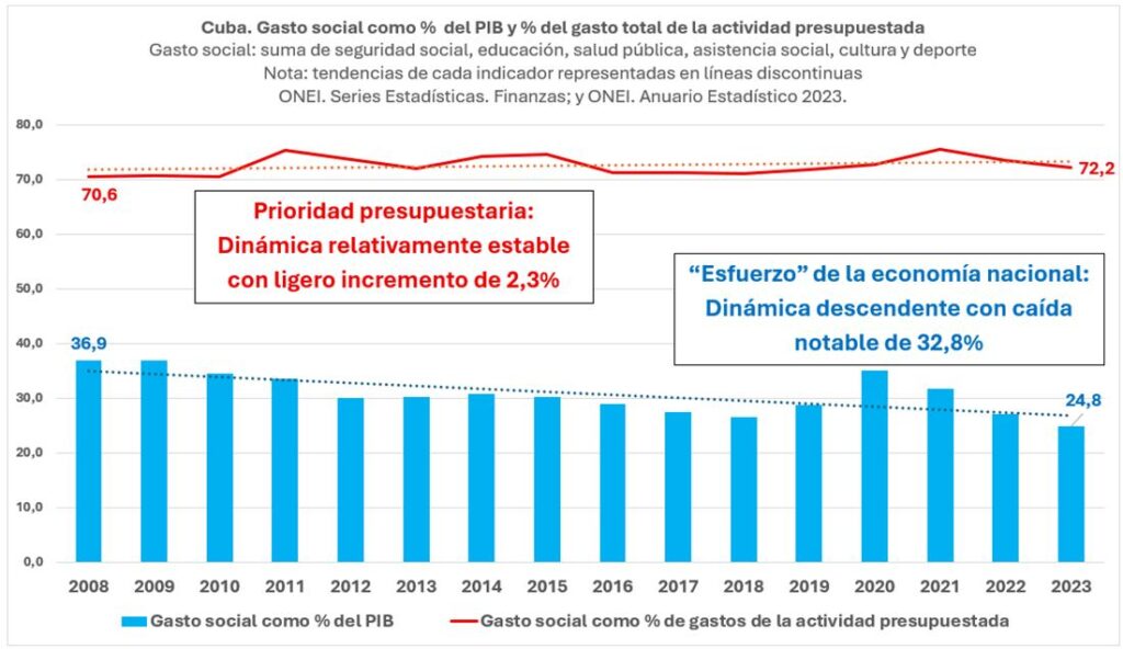 La Habana.- El atribuido “carácter social del presupuesto” es una pieza clave del relato oficial. Este relato destaca el alto % que ocupa lo social en el gasto de la actividad presupuestada. Sin embargo, soslaya la erosión de la base de ese “carácter social”. Esto se debe a la reducción del % que representa en el PIB del país.
