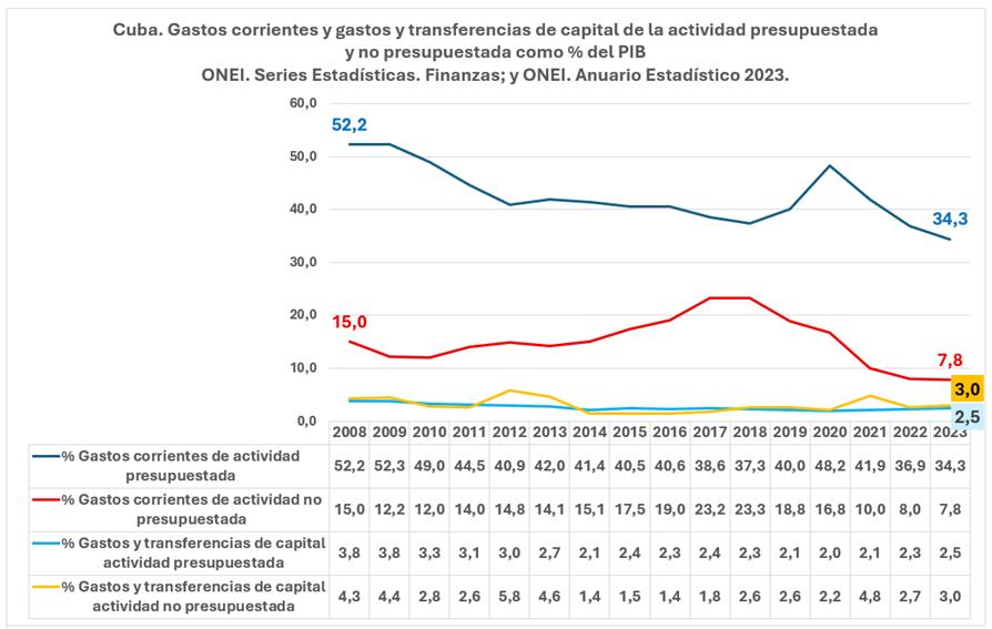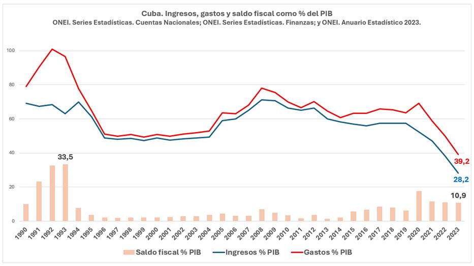 Frente a la inexorable contracción del peso relativo de los ingresos en el PIB, la aplicación actual de una política de austeridad fiscal en Cuba consiste en la reducción del gasto presupuestario como % del PIB.
