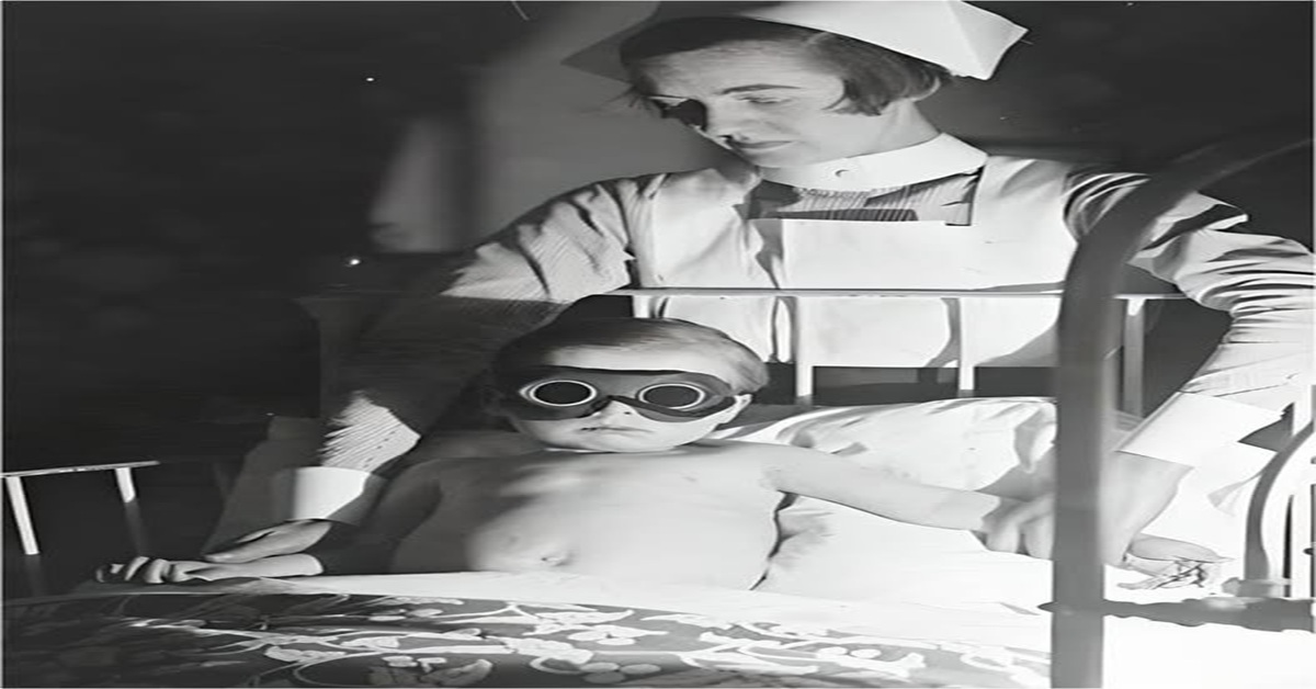 La Habana.- La fotografía, tomada en el Hospital Infantil Cheyne de Londres en 1928, muestra a un bebé con pequeñas gafas protectoras en brazos de una enfermera. El bebé está recibiendo fototerapia, un tratamiento que reflejaba la confianza ciega de la medicina de principios del siglo XX en el poder de la luz.