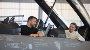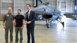 Madrid.- Vladímir Zelenski, en su papel de ‘gran héroe’ se hace una foto con un F-16 junto a Mark Rutte, el primer ministro de Países Bajos. La imagen es ideal para la prensa occidental, porque el anfitrión del presidente ucraniano le donará 42 aeronaves de ese tipo. Y Dinamarca otras 17.