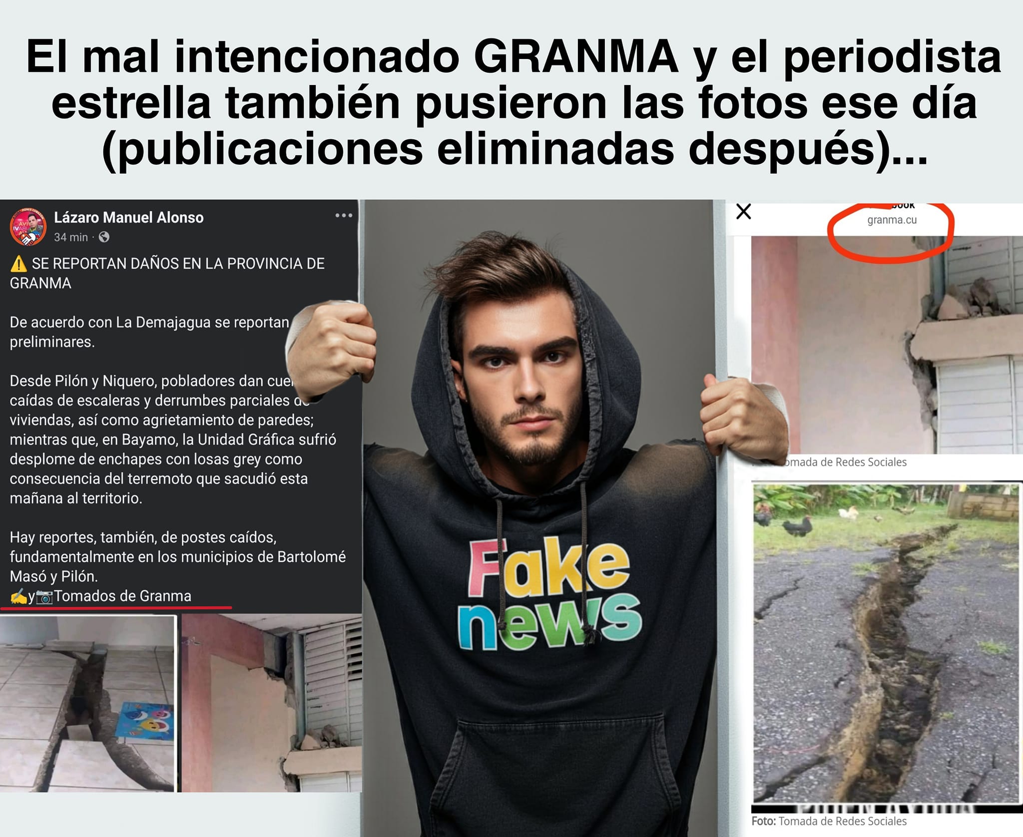 Dice el documento que «circulan imágenes que no corresponden al evento sísmico, con fotos de terremotos ocurridos en Puerto Rico. Además, una página mercenaria en X (Twitter), ha sido creada para publicar información falsa sobre la situación de la empresa eléctrica», pero resulta que muchas de esas fotos fueron publicadas en Granma, o por uno de los más vehemente voceros del castrismo, Lázaro Manuel Alonso.