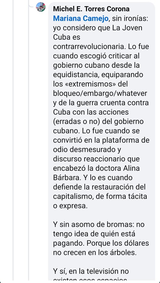 Pero tal aclaración no le sirvió de nada. En opinión de Michel Torres, La Joven Cuba continúa siendo «contrarrevolucionaria». Enfatiza que lo era en la etapa en que «se convirtió en plataforma del odio desmesurado y del discurso reaccionario encabezado por la doctora Alina López». Y lo sigue siendo «al defender la restauración del capitalismo de forma tácita o expresa».