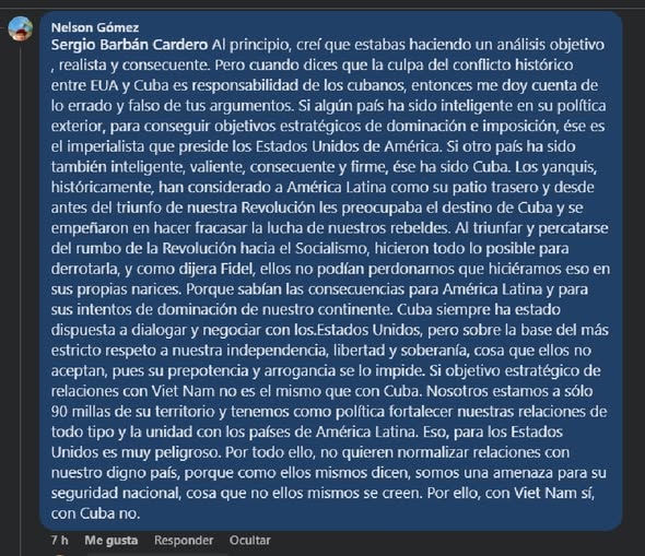 Hay comentarios que no buscan debatir, sino custodiar el dogma cubano. El del hombre idealista que se levanta cada mañana con un fusil imaginario en la mano y mira por la ventana en busca del enemigo. El de Nelson es una muestra perfecta; belicoso, autosuficiente, convencido de que la Historia con Estados Unidos terminó en 1962 y de que todo lo ocurrido después es culpa exclusiva del “imperialismo yanqui”. Ninguna sorpresa. Es el mismo libreto que el castrismo repite desde hace más de seis décadas.