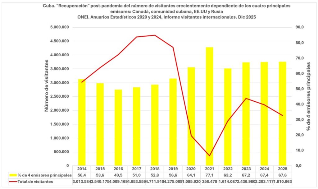 La “recuperación” post-pandemia del turismo internacional en Cuba nunca ha superado 51,7% del “pico” de visitantes de 2018. Además, ha cambiado hacia una estructura crecientemente dependiente de los visitantes de los 4 emisores principales: Canadá, comunidad cubana, EE.UU y Rusia.