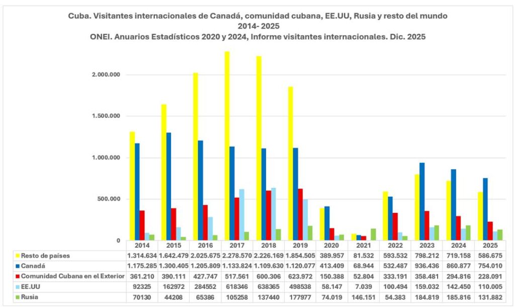 Una importante característica del turismo post-pandemia en Cuba ha sido el creciente predominio de los dos principales emisores -Canadá y comunidad cubana-. Desde 2022 han sumado entre ellos dos más visitantes que el total combinado del resto de los emisores.