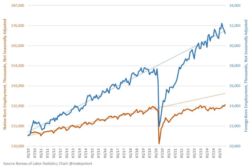 La Oficina de Estadísticas Laborales confirmó una fuerte caída del empleo de inmigrantes. A la par, hubo un aumento considerable del empleo nativo en áreas que siempre se nos dijo que ellos se negaban a hacer.