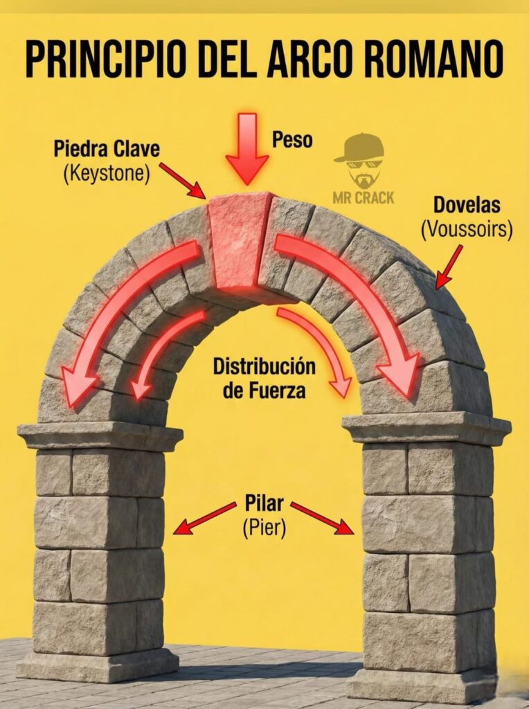 La respuesta no es magia, es pura física y geometría. El secreto de esta estructura inmortal radica en la Piedra Clave (Keystone). Es esa pieza central en forma de cuña que ves en la cima. Sin ella, todo se derrumba; con ella, el arco se vuelve indestructible.