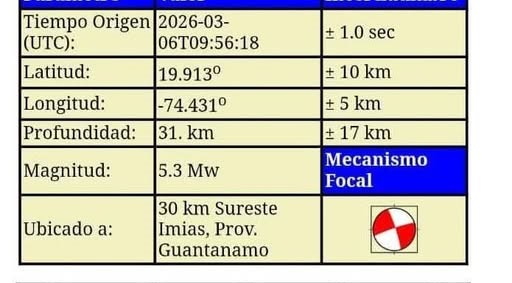 Enrique Diego Arango Arias, jefe de la institución, confirmó el evento a través de sus redes sociales. «Sismo perceptible con epicentro al sur de Imías, Guantánamo, 04:56:17 hora local, Mag:5.3 Prof: 10km», escribió el especialista en una publicación en Facebook.