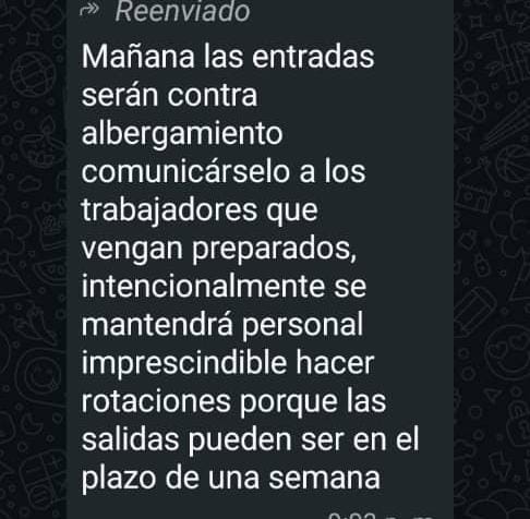 En dichas comunicaciones se informa que, debido a la escasez de combustible, las entradas al trabajo serán “contra albergamiento”. Es decir, los empleados deberán permanecer alojados en los hoteles durante varios días seguidos.
